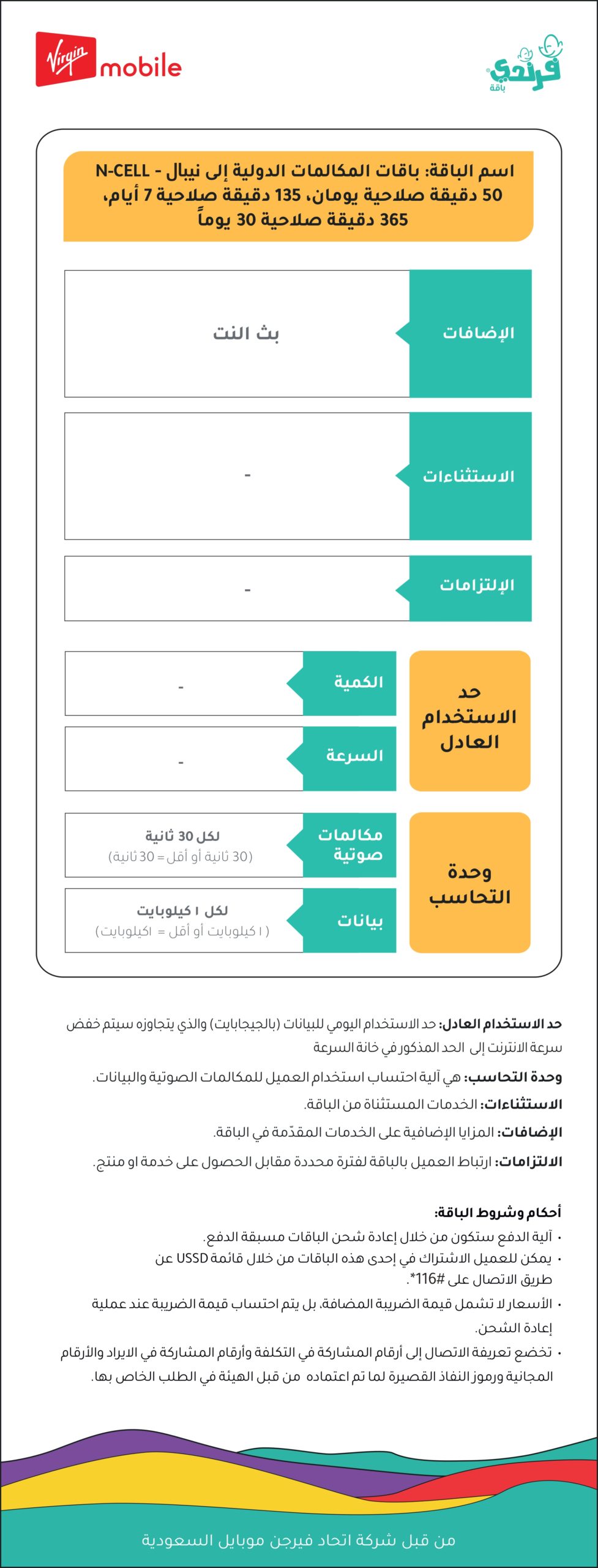 | نيبال (شبكة N-Cell) | 8 ريال | 8.63 ريال | 50 دقيقة | 2 أيام | |