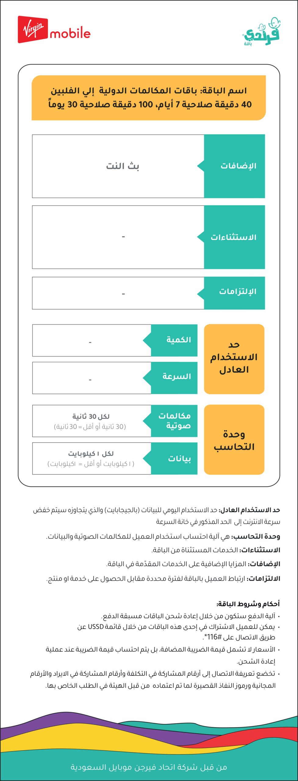 | الرسوم | مكالمة دولية | الدقائق محلية | البيانات | سوشال | الصلاحية | بطاقة الباقة |