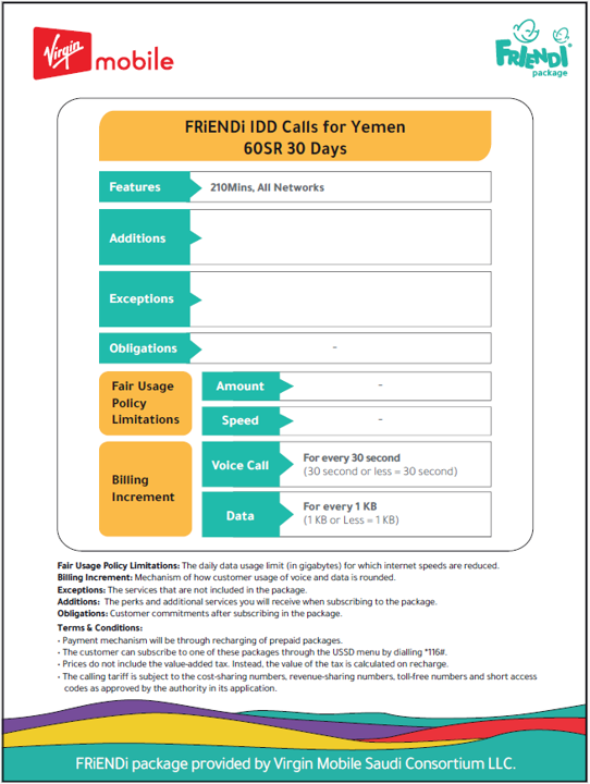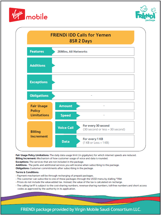مرحباً من المملكة العربية السعودية لكافة أرجاء العالم، في أي وقت صباحاً أو مساءً. سواء كنت تتصل للاطمئنان عن عائلتك أو للتواصل مع أصدقائك حول العالم، بإمكانك الحصول على تعرفة دولية منخفضة جداً مع عروض فرندي من فيرجن موبايل.